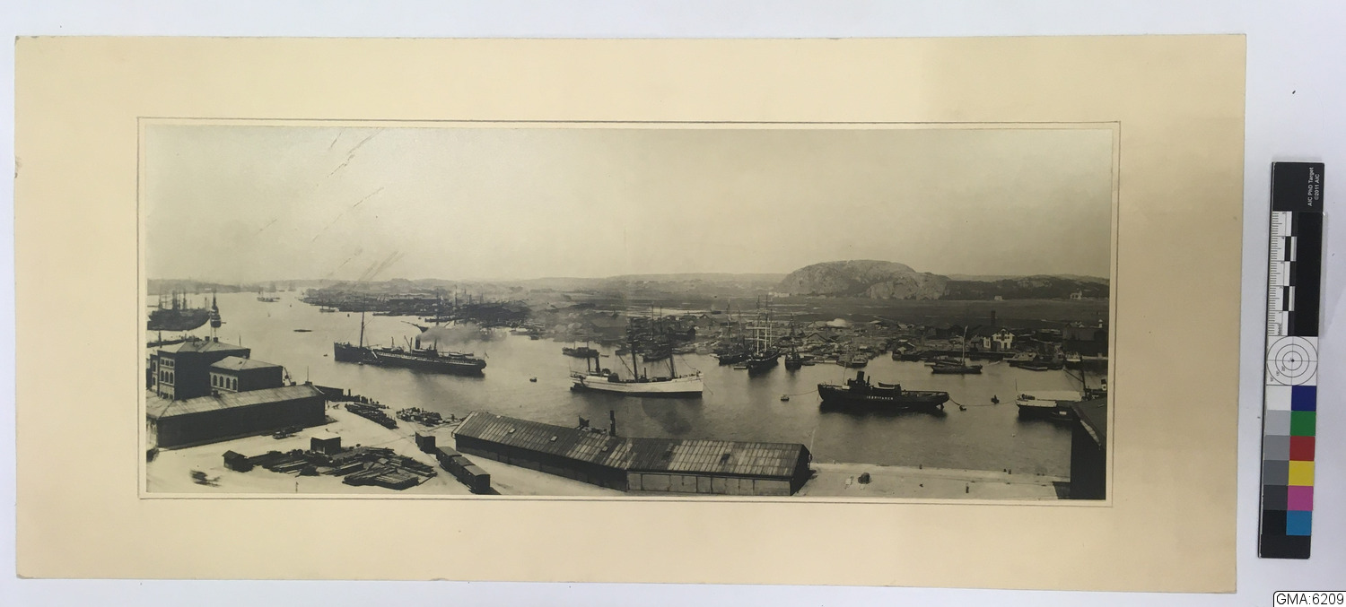 fotografi: Utsikt västerut över hamnen och Hisingslandet från Kvarberget. Omkring 1870-1880?