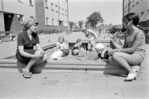 Gård på Drottninghög. så här minns en av flickorna på bilden: "Hej! Hade den stora glädjen att bli förflyttad till min barndoms sanddlåda, när jag tittade i HD onsdag 6/5! Ni efterlyste personerna på bilden - jag är flickan med krattan i handen som tittar in i kameran! Jag heter Alice van de Peppel. Om bilden är tagen i maj 1971, skulle jag snart fylla fem år. Jag bodde på Blåkullagatan 25c och hade sandlådan strax utanför vår lägenhet, där jag bodde med min mamma Kirsti, pappa Gerrit och storasyster Ulrika. Vi flyttade till Helsingborg från Gävle, då pappa fått jobb på ASEA 1968, och hamnade då på det barnrika Drottninghög. I vår trappuppgång med sex lägenheter bodde 12 barn, och så såg det ut på de flesta gårdarna omkring. Jag minns gårdarna som ganska betonggrå men å andra sidan hade vi kullarna och fälten, där nuvarande Dalhem finns, att leka och cykla på. Vidare på bilden kan jag med säkerhet säga att kvinnan med huvudduken är Elsa Andersson, mamma till min bästa kompis Maria som också bodde på Blåkullagatan, mitt emot oss. Troligtvis är flickan närmst Elsa (med brunt hår och nerböjt huvud) just Maria och någon av barnen med mössa Mats Andersson, hennes lillebror. De andra har jag inget minne av. Vi bodde på Drottninghög fram till 1973, då vi bytte staden mot landet. Mycket roligt att få se denna bild och minnas lite! Finns det en möjlighet att få en kopia? Många hälsningar. Alice van de Peppel"