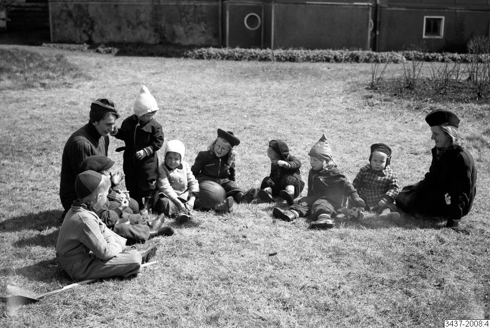 Fredrikornas barnträdgård är något alldeles nytt i sitt slag, som man starta, uppmuntrad av framgången med barnvakten i hemmet. Att idén kommit att förverkligas har man främst avlidne teol. dr. C. L. Johanssons familj att tacka för. Det är nämligen i trädgården till hans villa uppe på Öresundsparkens platå, som småttingarna håller till med sin barnträdgård. --- Barnen få leka fritt och efter behag. Något tvång att delta i den ena eller andra sysselsättningen är det inte fråga om, säger fru Björklund. Barnen äro förresten ännu för små för att ha glädje av några lekar, de äro alla i ålder mellan 2-6 år. Yngste deltagaren i barnträdgården har ännu inte två vårar på nacken, men han tycks trivas gott bland sina litet mera försiggkomna kamrater.