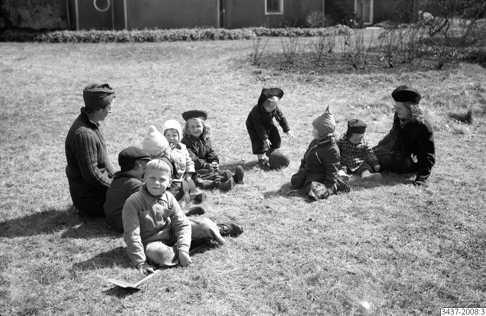 Beskrivning: Fredrika Bremerförbundet drev barnträdgård i en trädgård invid Öresundsparken. Ur Skånska socialdemokraten: "Tjugo pigga hälsingborgssmåttingar ha i dagarna fått sitt eget soliga vårrike att tumla om i efter behag ch lust de närmaste fem veckorna. Det är Fredrika Bremerförbundets initiativrika damer, som ställt om den saken till glädje för småfolkets mammor, som därigenom få några timmar för sig själva under dagens lopp. Denna fredrikornas barnträdgård är en ny form av den barnvakt som lokalavdelningen med framgång drivit i Hälsingborg ett par år. Avdelningens damer ha de senaste vintrarna suttit otaliga "barnvakter" hemma i familjerna när mammorna varit bortbjudna eller ute i något ärende. Meningen med arrangemanget har varit att hjälpa de mammor, som ha småbarn och äro bundna vid hemmet hela dagen igenom. Barnvakten är ännu en ung institution i Hälsingborg, men den har trots det redan vunnit en grundmurad popularitet bland mammor med små barn. Fredrikornas barnträdgård är något alldeles nytt i sitt slag, som man starta, uppmuntrad av framgången med barnvakten i hemmet. Att idén kommit att förverkligas har man främst avlidne teol. dr. C. L. Johanssons familj att tacka för. Det är nämligen i trädgården till hans villa uppe på Öresundsparkens platå, som småttingarna håller till med sin barnträdgård. --- Barnen få leka fritt och efter behag. Något tvång att delta i den ena eller andra sysselsättningen är det inte fråga om, säger fru Björklund. Barnen äro förresten ännu för små för att ha glädje av några lekar, de äro alla i ålder mellan 2-6 år. Yngste deltagaren i barnträdgården har ännu inte två vårar på nacken, men han tycks trivas gott bland sina litet mera försiggkomna kamrater. Trädgården ligger lugnt och är väl skyddad för blåst och verkar på alla sätt idealisk för sitt ändamål. Barnvakten pågår alla vardagar mellan kl 10-1 och fru Björklund meddelar intresserade mammor att hon och hennes kvinnliga medhjälpare, fröken Wallin, ännu kan ta emot ett antal småttingar. Blir det regn ha de små möjligheter att krypa inomhus i den stora villan, som står tom sedan många år tillbaka. Avgiften för 10 besök i barnträdgården är kr 7:50."