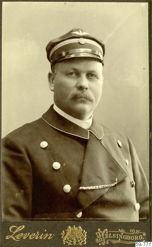 Svartvitt porträttfotografi. Ateljéfotografi, bröstbild, halvprofil. Mannen på bilden är på baksidan av fotografiet omnämnd som "Lindström / Ramlösa". Han är iklädd uniform och uniformsmössa. Bilden är monterad på ataljékartong med på framsidan tryckt text: "Leverin HELSINGBORG". På baksidan tryckt dekor och tryckt text: "G. Hj. Leverin, / Helsingborg / Hörnet af / Bärgaliden & Storgatan. / Plåten förvaras. / AS". På baksidan står även skrivet för hand: "Lindström / Ramlösa".