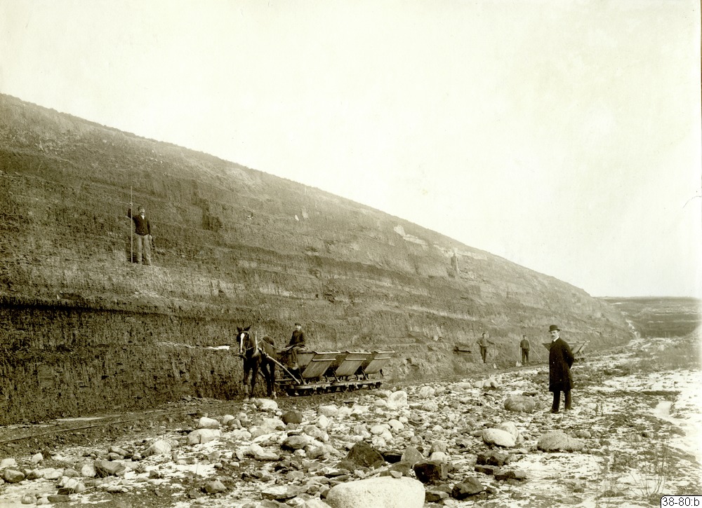 Svartvitt fotografi uppfodrat på papp. Föreställer "Lergraven", mot Fältarpsvägen, i Helsingborg. På bildens ses ingenjör H.T. Dahlén granska arbetet vid lertäkten. Framför honom står en draghäst med tre vagnar bakom sig. På den främre vagnen sitter en man med tömmar i händerna. Vagnarna dras längs ett rälsförsett spår. Ytterligare fyra arbetare står utplacerade längs med lerväggen.