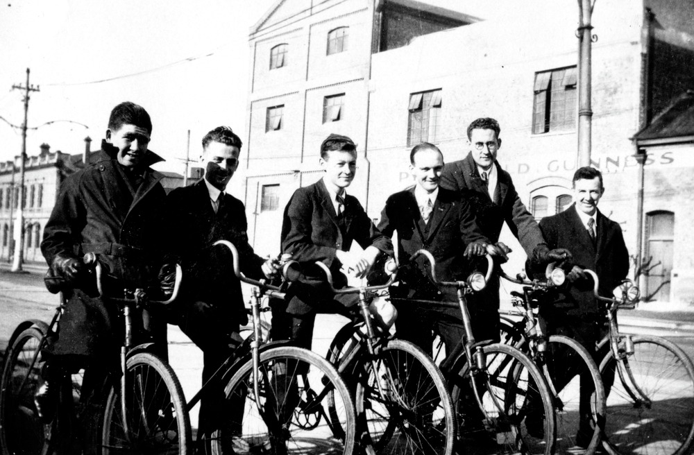 Bilden föreställer sex män stående bredvid varandra och med varsin cykel, i bakgrunden en stadsgata och husfasader.