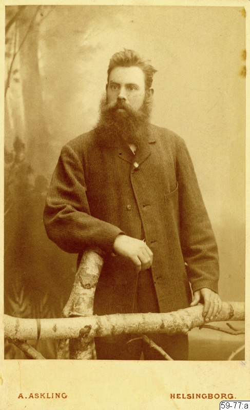Svartvitt porträttfotografi. Ateljéfotografi. Föreställer snickare A.M. Östlund iklädd rock. Bakom honom syns en kuliss med skogsmotiv, framför honom ett par trästockar.