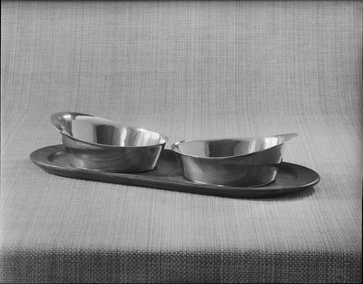 Titel: GULDRING SAMT SILVERSKÅLAR PÅ TRÄBRICKA