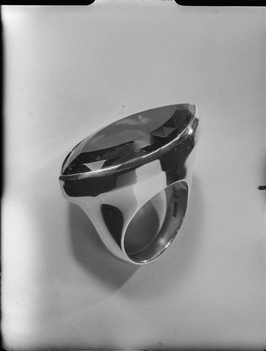 Titel: GULDRING SAMT SILVERSKÅLAR PÅ TRÄBRICKA