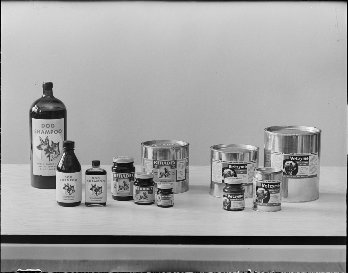 UPPSTÄLLNING AV OLIKA BURKAR FÖR HUNDVÅRD (VETGYME M FL)