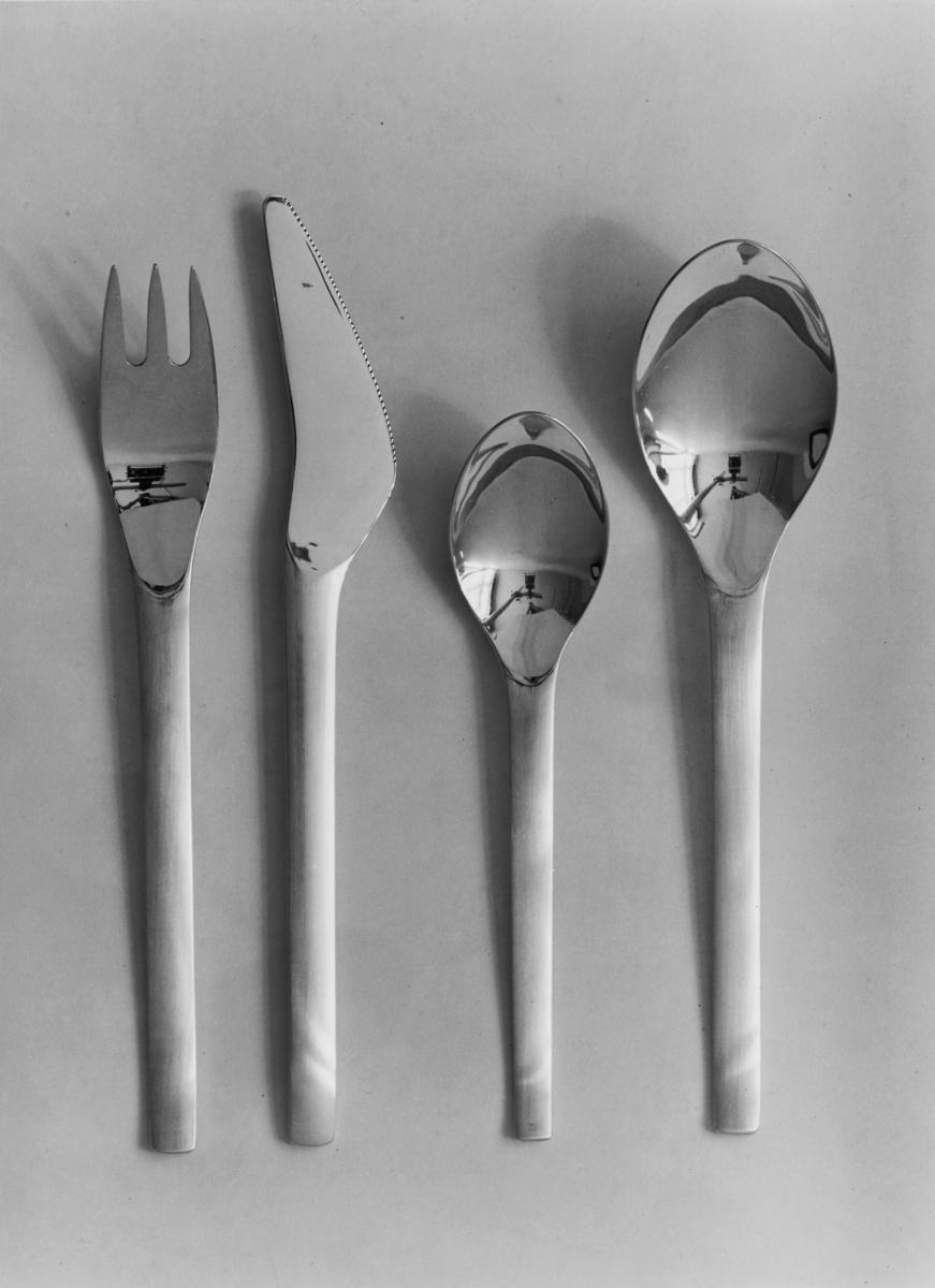 Tävlingsbestick med gaffel, kniv, tesked och sked. Beställda av SAS-reklamavdelning.