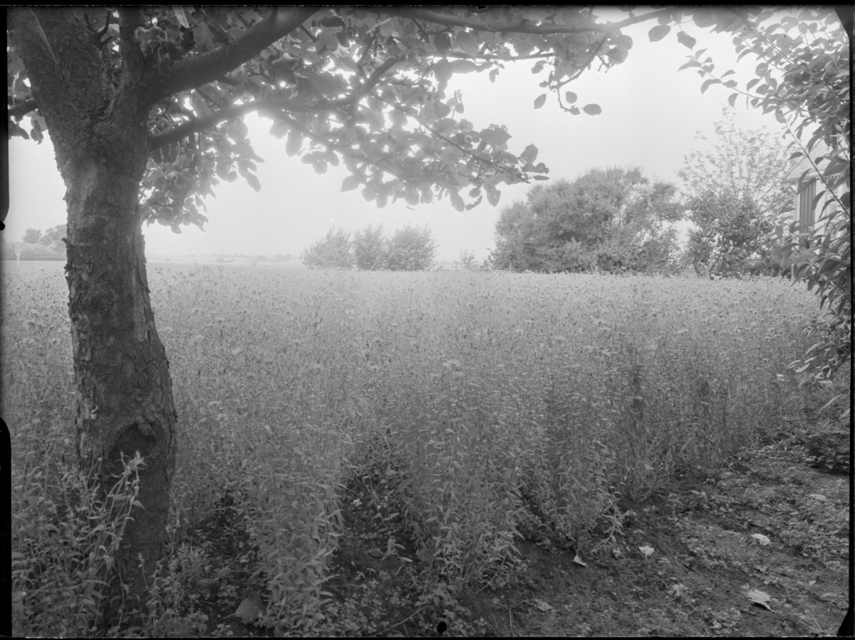 Titel: TRÄDGÅRD I SKÅNE MED HÄCK OCH RÖTT LIN