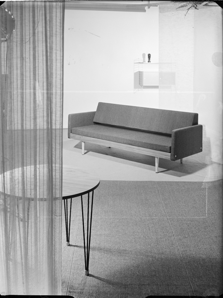 Titel: OMSLAG STRING I BILDEN, BÄDDSOFFA MED ARRANGEMANG I ATELJEN
