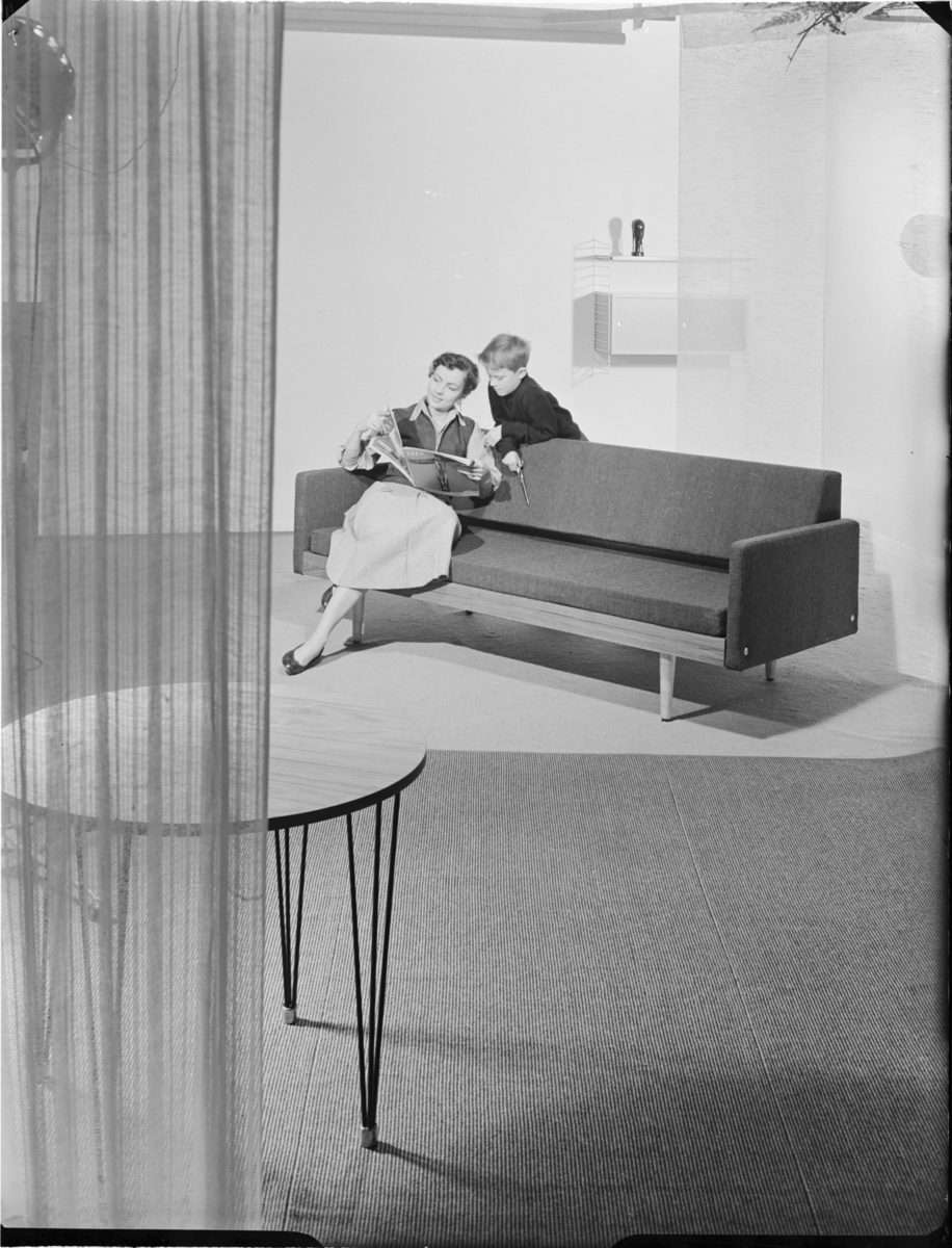 Titel: OMSLAG STRING I BILDEN, BÄDDSOFFA MED ARRANGEMANG I ATELJEN