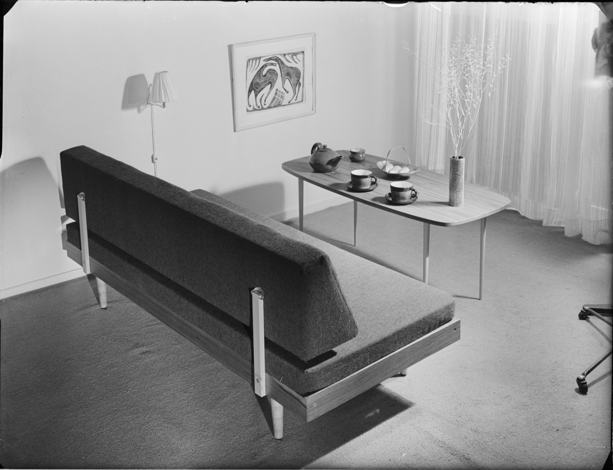 Titel: OMSLAG STRING I BILDEN, BÄDDSOFFA MED ARRANGEMANG I ATELJEN