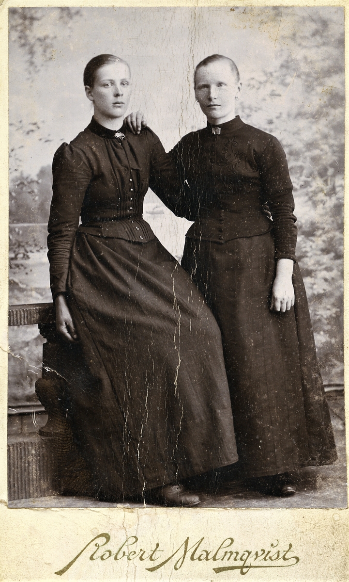 Ateljéfoto med två okända unga kvinnor, troligen systrar. Den ena sitter mot en balustrad och håller den andra om livet. Båda bär mörka kläder med en brosch i halsen. Förmodligen taget i Halmstad.
