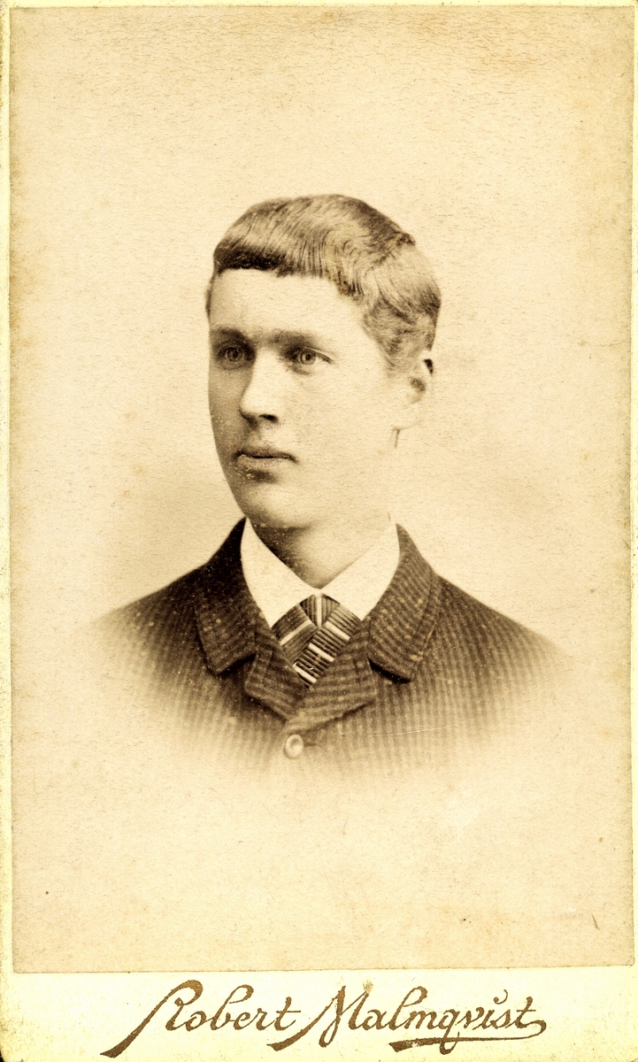 Ateljéporträtt av en okänd ung man med lugg och smårutig kavaj. Troligen fotograferad i Halmstad.