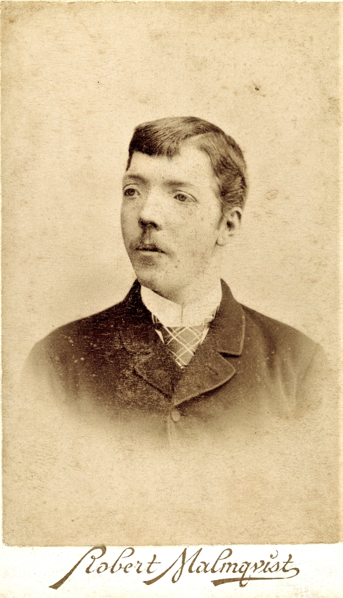 Ateljéporträtt av en okänd ung man med lugg, mustasch och rutig slips. Troligen fotograferad i Halmstad.