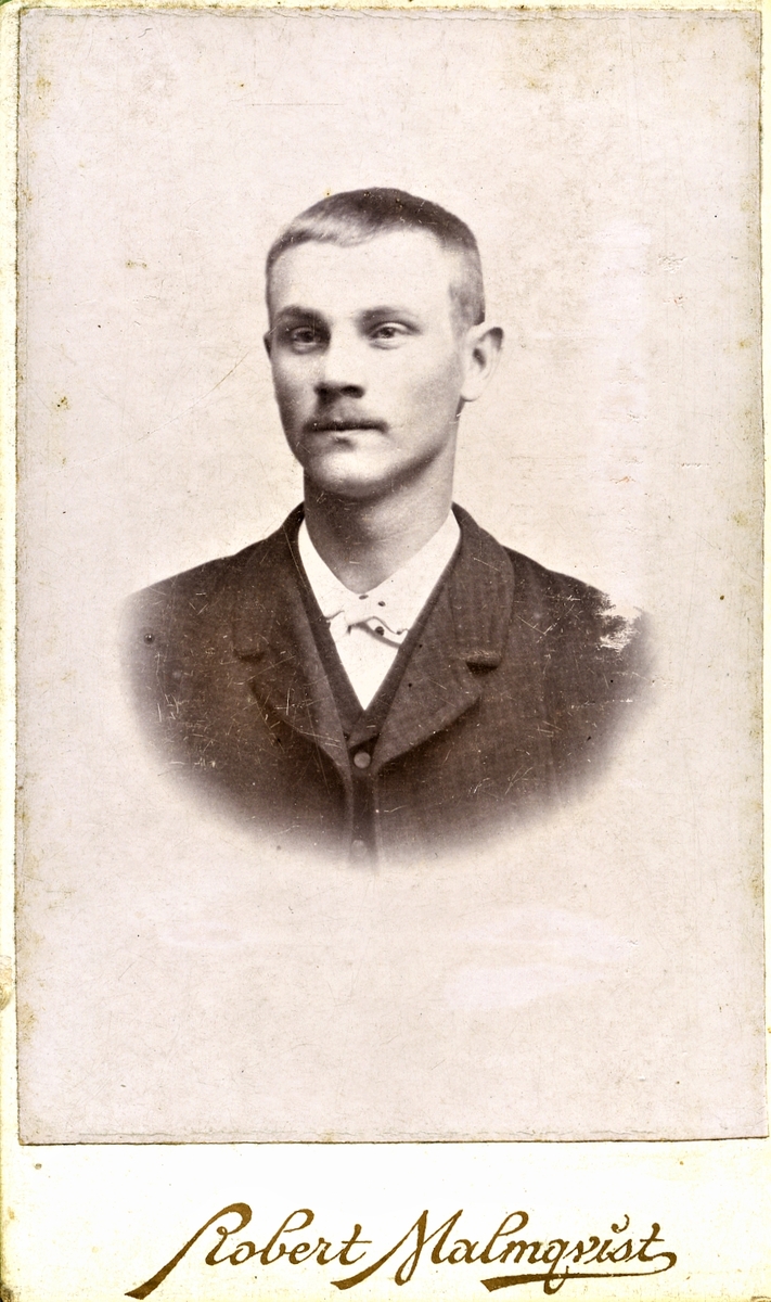 Ateljéporträtt av en okänd ung man med mustasch och smårutig kavaj. Troligen fotograferad i Halmstad.