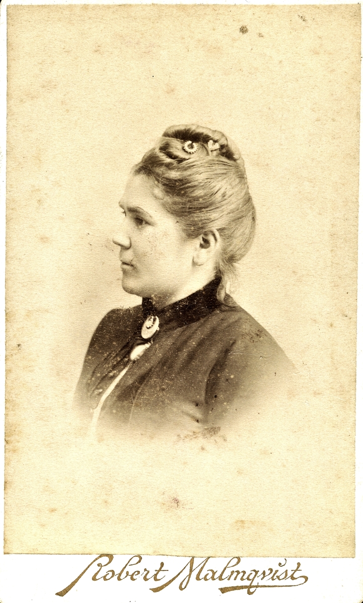 Ateljéporträtt av okänd ung kvinna i profil med uppsatt hår, hårnålar och brosch på halskragen. Troligen fotograferad i Halmstad.