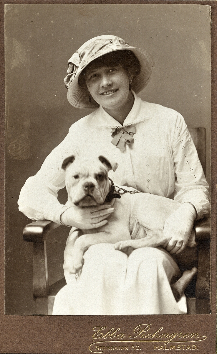 Ateljéporträtt av en okänd kvinna med hund i knät. Kvinnan bär hatt och handskar till dräkten, allt i ljus ton.