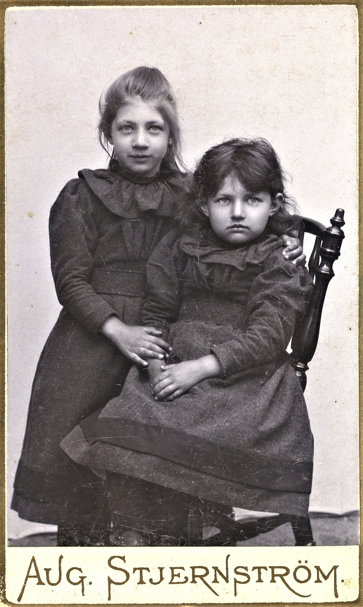 Ateljéfoto av två okända små flickor i likadana, mörka klänningar med stora veckade kragar, sannolikt systrar; den yngre sitter på en stol och den äldre står bredvid. På kortets baksida står det "August Stjernström. Tournéen i Halland.", krönt av Hallands vapen. Men han lär ha haft en ateljé på Östra Vallgatan i Halmstad.