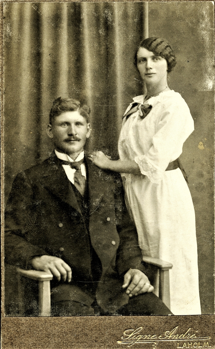 Ett ungt, okänt par fotograferat i Laholm. Mannen sitter i en stol och kvinnan står bredvid med handen på hans axel. Båda bär ringar så troligen är det ett förlovningsfoto. hennes hår är uppsatt och ondulerat (vågigt). Han har sidbena och mustasch.