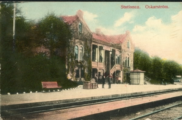 Handkolorerat vykort, "Stationen. Oskarström." Vykortsförlag: Lorentz Larsson Lund. Järnvägsstationen ligger längs Halmststad-Nässjö Järnväg på bandelen mellan Halmstad-Landeryd, anlagd 1877. En kombinerad banvaktsstuga och station uppfördes då, men på 1880-talet (troligen 1882) uppfördes denna stationsbyggnad i två våningar med utvändig trappa upp till en veranda. Från stationen byggdes stickspår både till Jutefabriken och Sulfitfabriken.