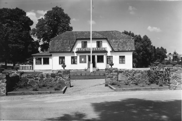 Exteriörbild av Simlångsdalens Gästgivaregård. Byggnaden har valmat mansardtak med entrén i en liten utbyggnad. Ovanför denna sitter en fasadskylt, "Gästgivaregården". Tomten hägnas av en stenmur som vinklas vid infartsöppningen, flankerad med krukor på fot. På ömse sidor är rabatter anlagda i murhörnen. Framför byggnaden är en gårdsrundel anlagd med flaggstång mitt i rabatten.