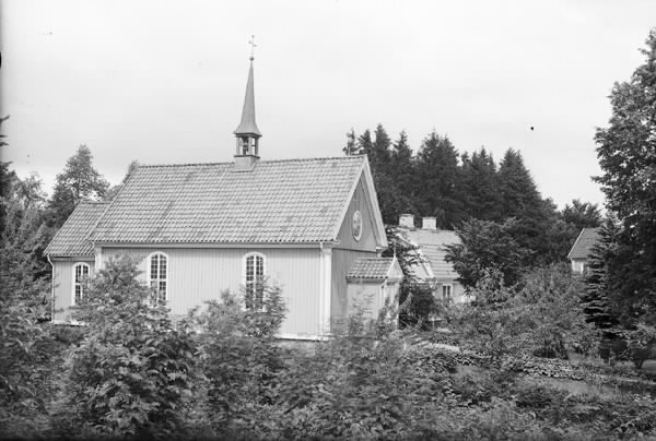 Exteriörbild av Mariakyrkan, Oskarströms katolska kyrka, omgiven av träd. Kyrkan är romersk-katolsk och uppfördes på önskemål från fabriksarbetarna vid Jutevävsfabriken i Oskarström, invandrade från katolska europeiska länder. Kyrkan stod klar 1925, uppförd i trä med ett smalt litet klocktorn mitt på sadeltaket och tidstypiskt klassicerande hörnpilastrar. Ingången är i den lilla utbyggnaden på gaveln. Bortom kyrkan syns lite av prästgården. Detta var Hallands första katolska kyrkobyggnad. 1928 kom tre polska Mariasystrar hit och lät 1930 uppföra ett hus där de inrättade Katolska barn- och vilohemmet, vilket skymtar till höger.