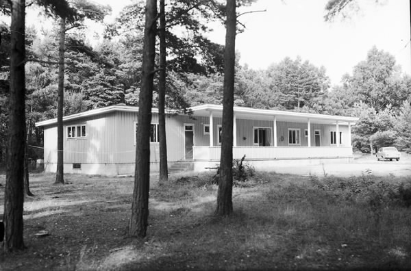 Exteriörbild av Oskarströms barnkoloni i Vilshärad med omgivande skog. Längs fasaden sträcker sig ett skärmtak på pelare mot staketet. Till höger står en bil parkerad.