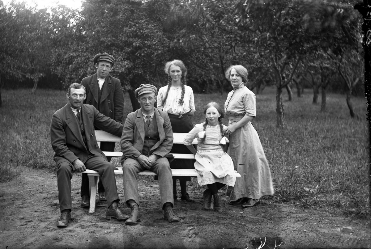 Familjen Hansson, Syllinge, Hansa i Veddige. Till vänster Julius Hanssson och till höger systern Gärda. Familjen är samlad kring en soffa i trädgården. Döttrarna bär flätor.