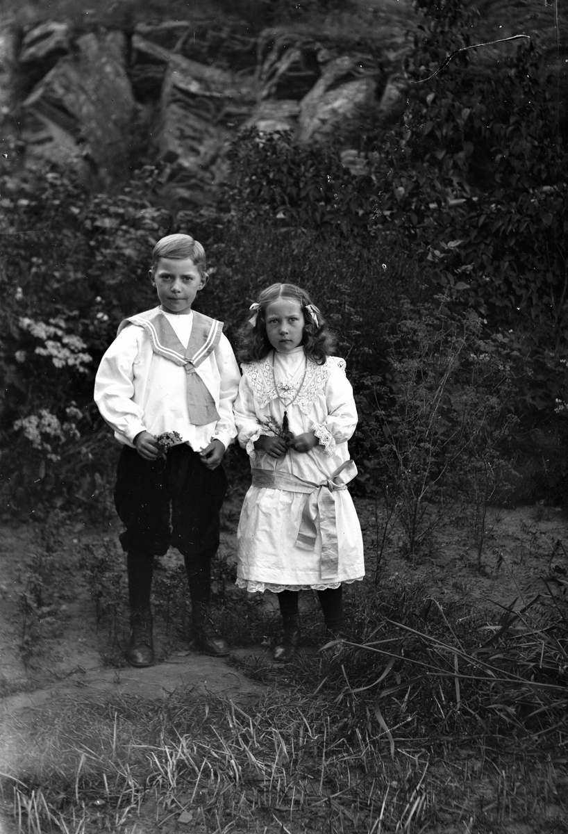Två små finklädda barn står ute vid foten av ett berg med små blomkvistar i händerna. Pojken är klädd i kortbyxor och sjömansskjorta med annan färg på kragen. Flickan har en ljus klänning med spetsar på krage, ärmar och nedtill. Ett brett band i rosett sitter nedhasad på klänningen och i håret har hon rosetter på båda sidor.