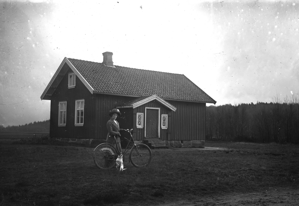 Ung kvinna med cykel och en liten hund intill en byggnad som ligger för sig själv, utan tomtmarkering, på vidsträckt åkermark. Troligen har huset någon officiell roll. Kvinnan bär dräkt, stor hatt och handskar. Cykeln har ett virkat kjolskydd på bakhjulet.