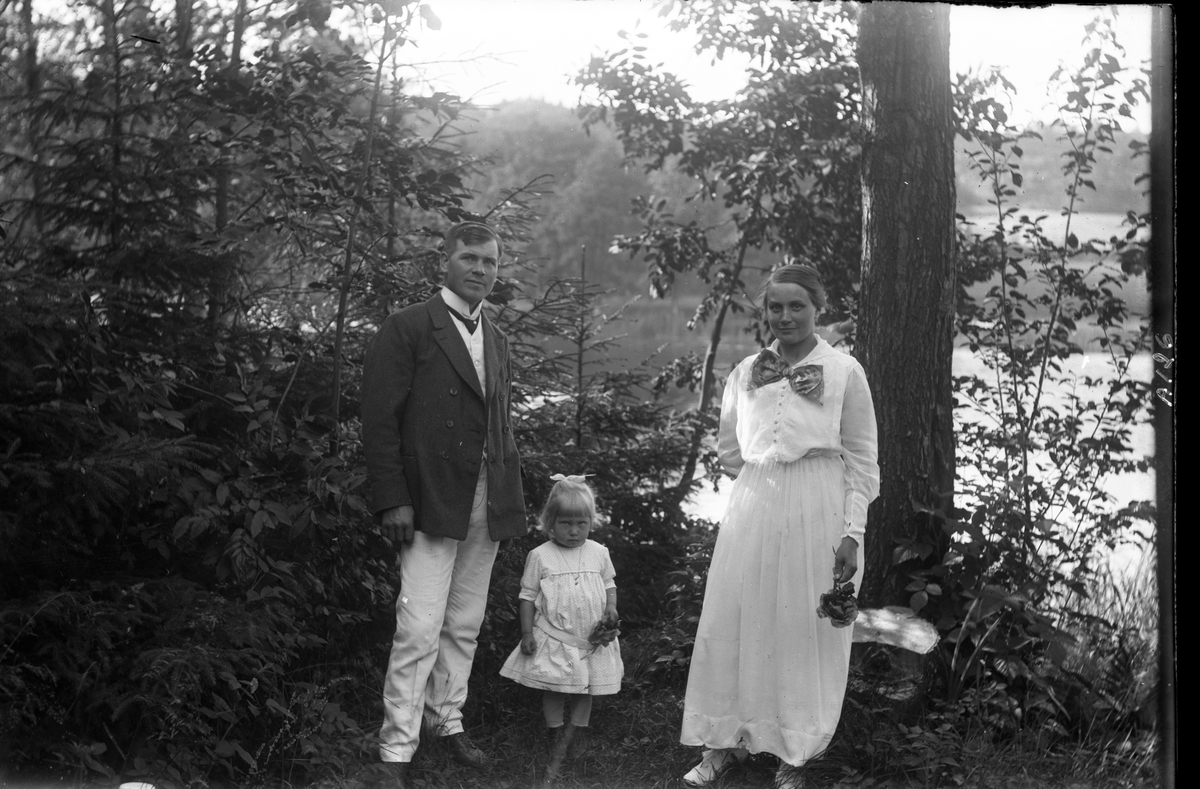 Ett ungt par med en liten flicka på en höjd ovanför en sjö, eller å. Alla bär ljusa sommarkläder.