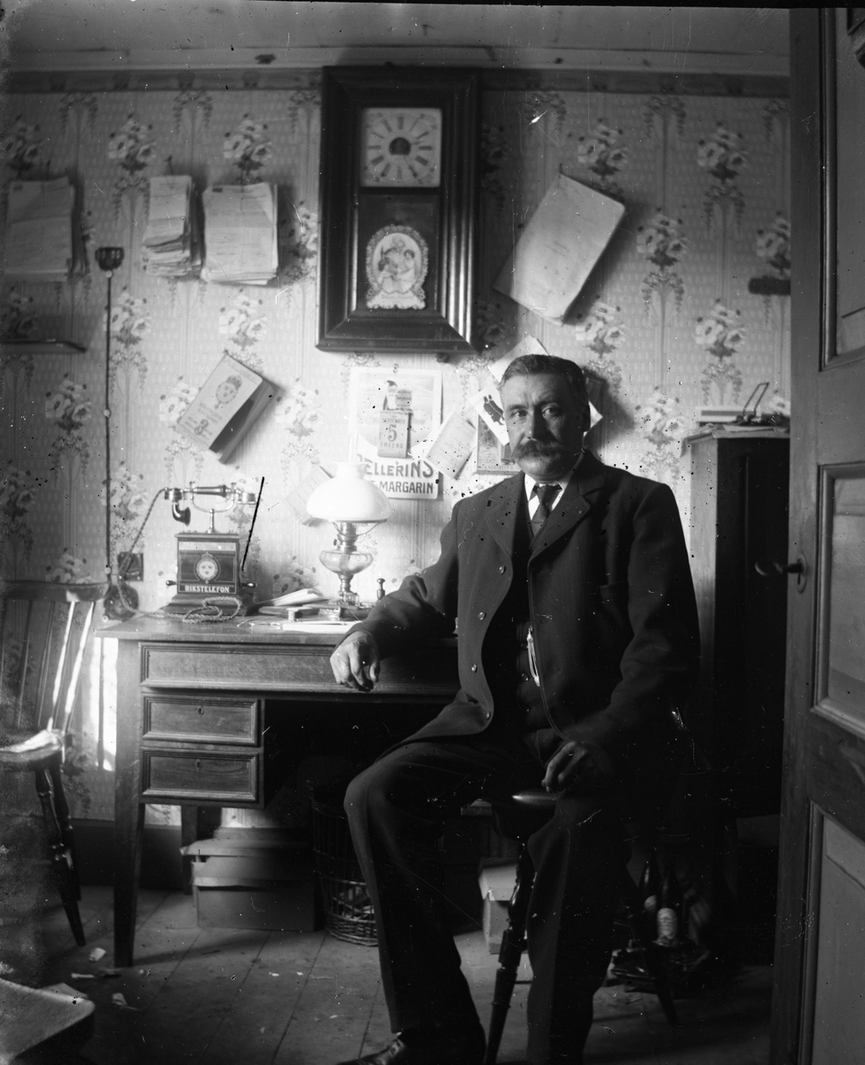 En man sitter vid ett skrivbord där det står en Rikstelefon. Ovanför den hänger en telefonkatalog och buntar med olika dokument. Almanackan med reklam för Pellerins margarin har inte många blad kvar, så troligen är det fredag den 5:e december och då kan året vara antingen 1913 eller 1919.