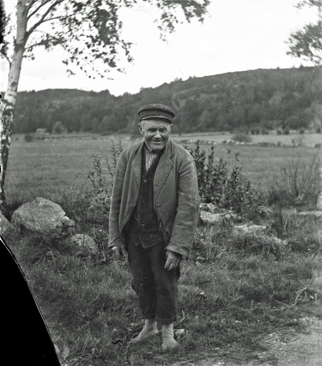 En man står barfota utomhus i gräset med åkerlandskap och berg i bakgrunden. (Negativet är skadat i vänster nedre hörn)