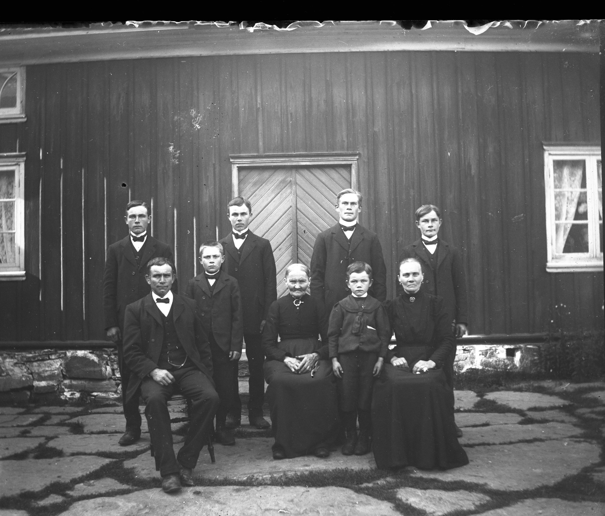 Familjen samlad på den stenlagda gården framför manhuset på Ulvatorp 1, Kullen i Sällstorp. Alla är mörkt klädda, i mitten sitter en äldre kvinna omgiven av sju stående pojkar och sannolikt deras föräldrar som sitter. Männen bär alla fluga, utom den minsta pojken som har sjömanskrage. Kvinnorna har örhängen och broscher; den äldre kvinnans brosch påminner om ett dräktsmycke.