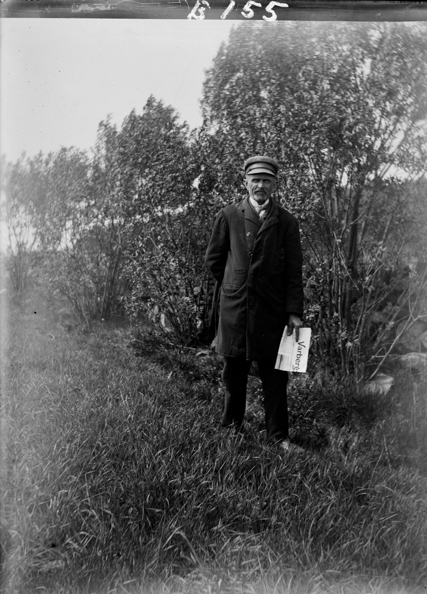 En man i skärmmössa och rock på ett gärde med tidningen "Varbergsposten" i handen. Bakom honom växer höga buskar utmed en stengärdesgård.