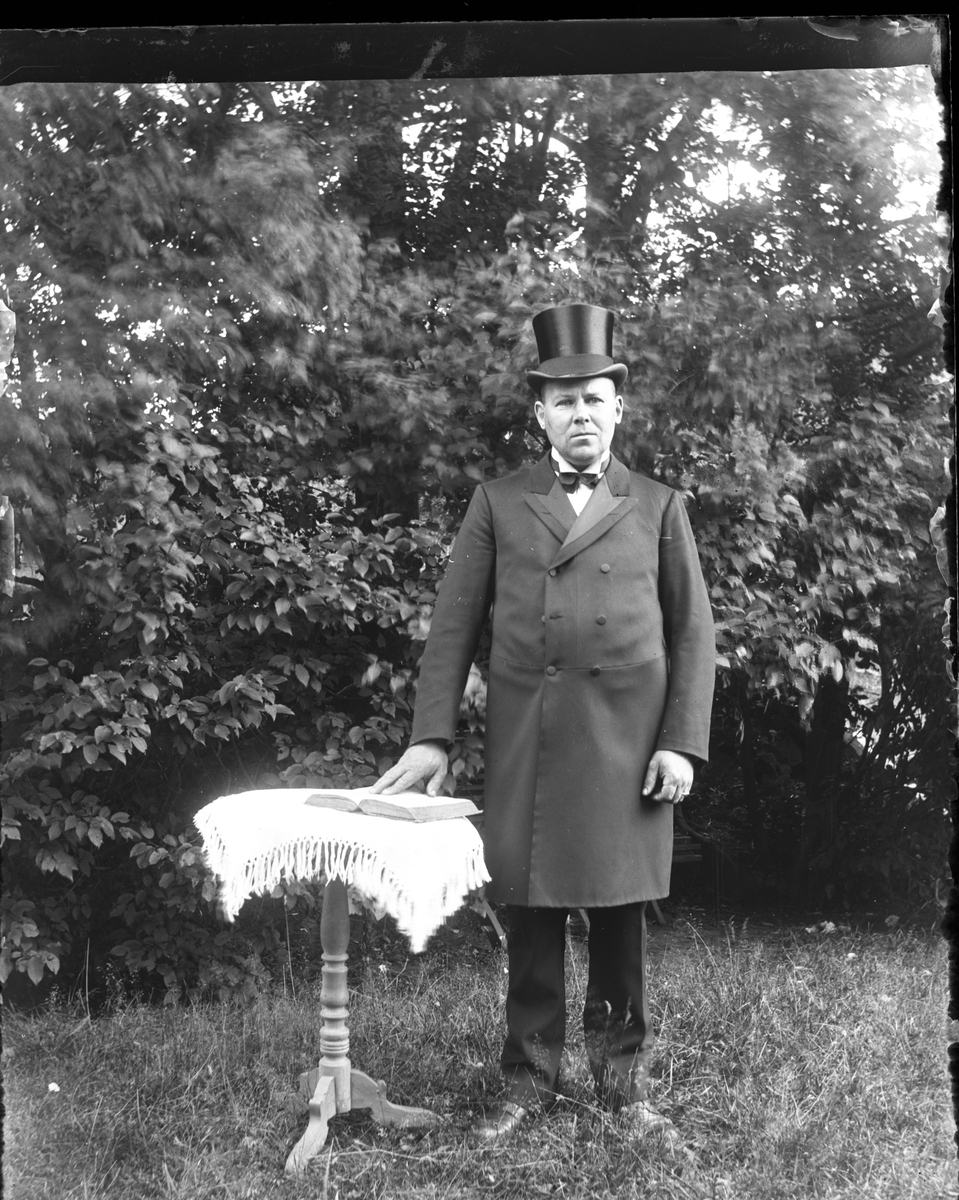 En man iklädd rock och cylinderhatt står i en trädgård vid ett litet pelarbord med duk och håller handen på en uppslagen bok, som ligger på bordet.