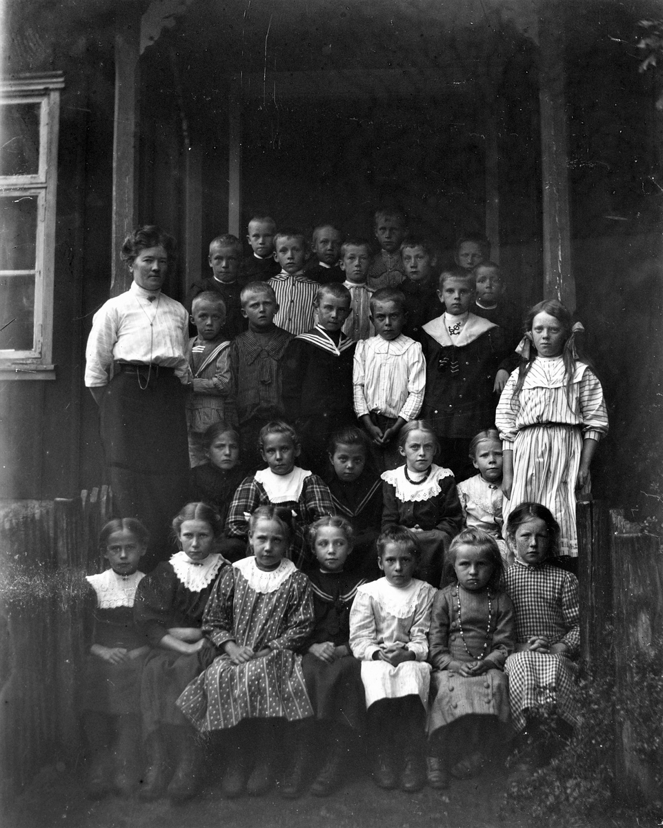 Elever samlade med lärarinnan på skolans farstukvist. Pojkarna står upptill och flickorna, utom en, sitter ned framtill.