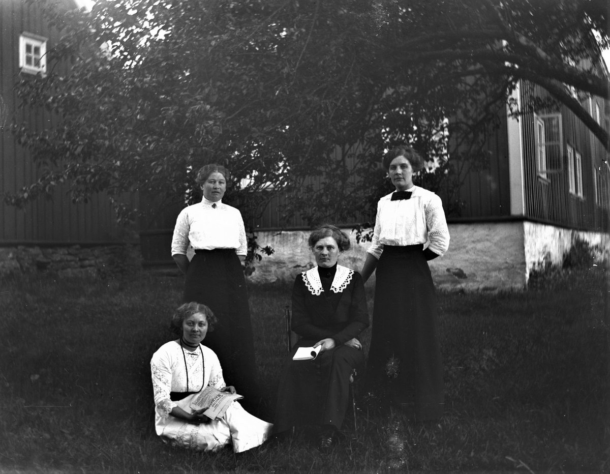 Fyra kvinnor fotograferad vid ett träd utanför ett par stora byggnader, som ligger i vinkel. En sitter i gräset med en tidning, där det görs reklam för Bulgarisk marmelad. En annan sitter på en stol med en tunn bok i handen och två står på på ömse sidor om henne.