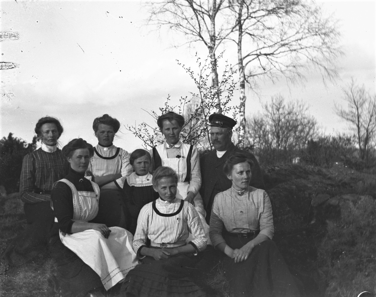 Sju flickor och en man, Sällstorpsbor, sitter på en bergknalle och de flesta bär en Majblomma, så det lär vara kring 1:a maj. Två har likadana klänningar och broscher och två andra bär förkläden; möjligen är detta en grupp med tjänstefolk av olika slag, förutom flickan.
