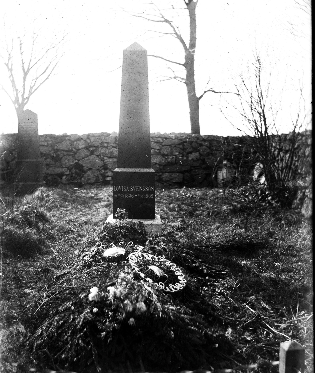 Grav vid obeliskformad gravsten för Lovisa Svensson, död 30 januari 1909. Gravkullen täcks av granris, en blomsterbukett och två s k pärlkransar. Detta blev från omkring sekeskiftet 1900 en vanlig gravdekoration i södra Sverige. Modet spreds från Frankrike på 1870-talet och tillverkningen kom till stor del att ske i södra Tyskland. Pärlkransarna bestod av sammanflätad ståltråd som dekorerades med glaspärlor i olika färger och modeller, vilka börjat massproduceras. I mitten av kransen lades en religiös figur skapad av gips, celluloid eller annat, t ex ett kors eller en ängel, under en glaskupa. Text kunde också införlivas i dekoren. Pärlkransarna importerades och kunde köpas av pappershandlar, handelsträdgårdar m fl. På somliga ställen kunde fattiga låna en pärlekrans.