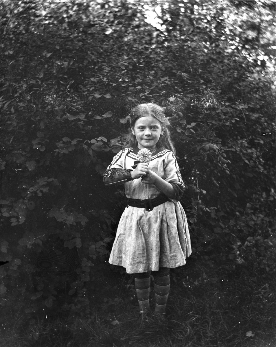 En liten flicka står framför ett buskage och håller i en blomma, en dahlia. Hennes ena arm hålls i vinkel av en skena med snörning. (Se även bilderna GEB180, GEB183)