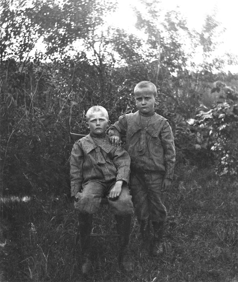 Två pojkar i randiga dräkter med sjömanskragar poserar utomhus för fotografering. Den ene sitter på en stol.