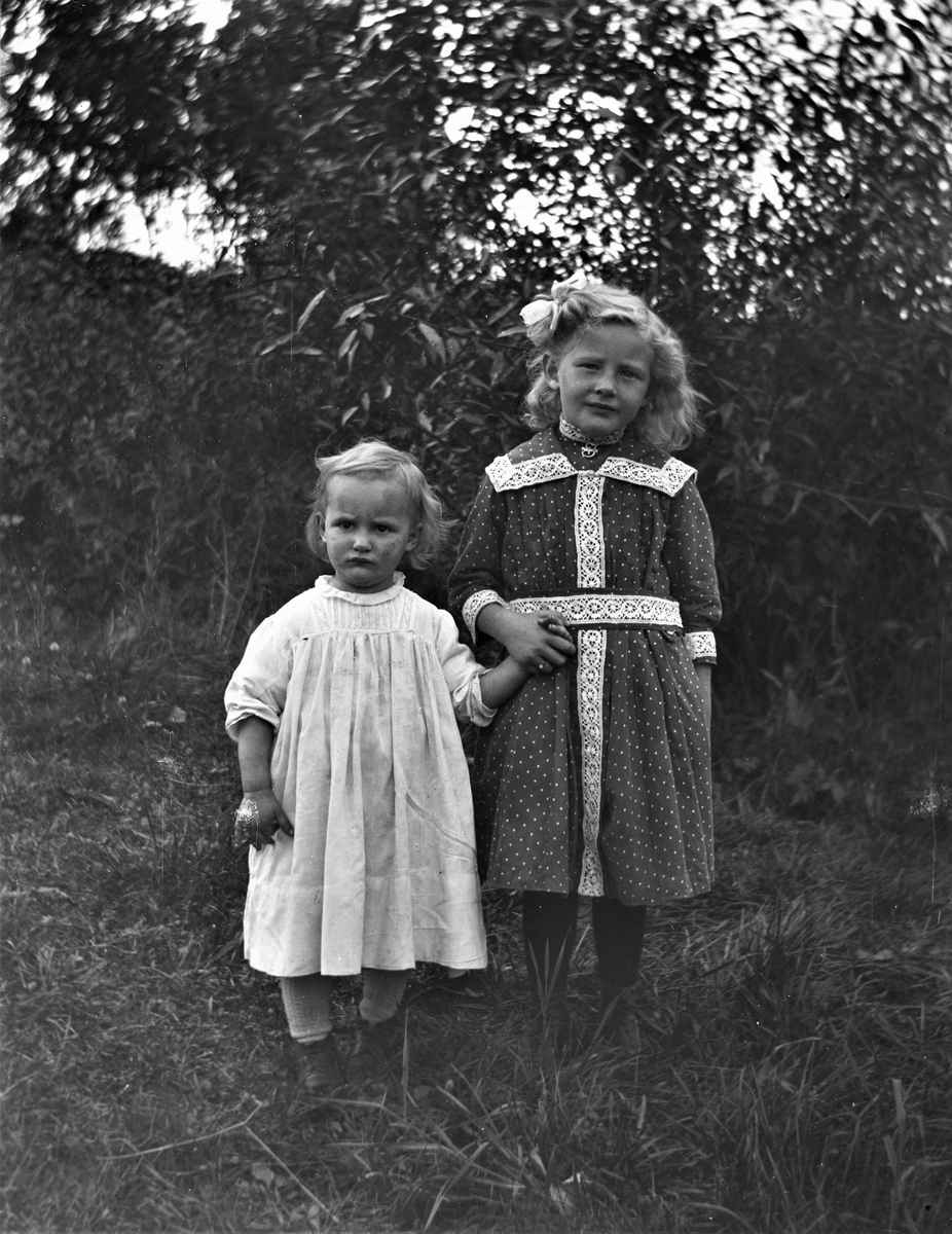 Två små barn fotograferade utomhus. Den äldre flickan har en prickig klänning med dekor av spetsband och en rosett i håret. (Se även bild GEA075 och GEA077)