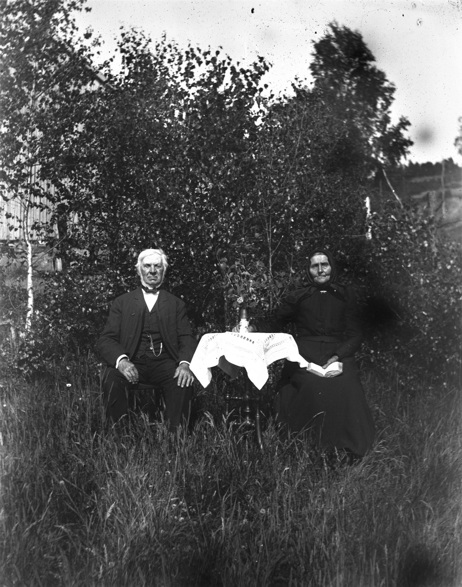 Ett äldre par sitter i en trädgård vid ett bord med duk. Han har skepparkrans och en klockkedja i västen. Hon bär huckle och mörk dräkt med en brosch i halsen, håller en bok i knät och med andra handen håller hon om vasen på bordet.