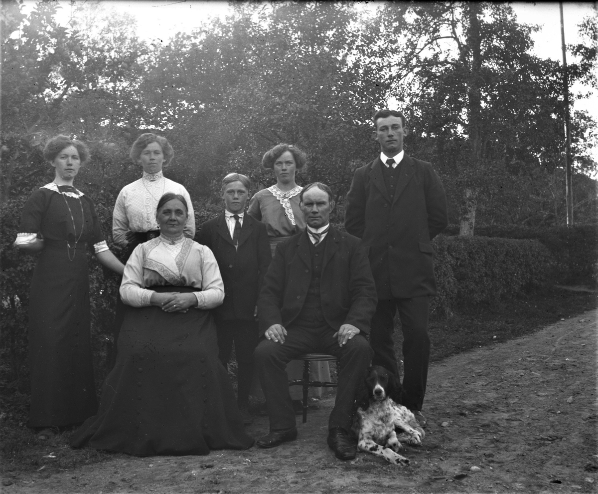 Ett sällskap om sju personer och en hund samlade utomhus vid en häck och grusgång för fotografering. Jenny och Johan sitter med barnen omkring sig. Sönerna heter Arvid t v och Sven till höger. Syllinge, Jonasa i Veddige.