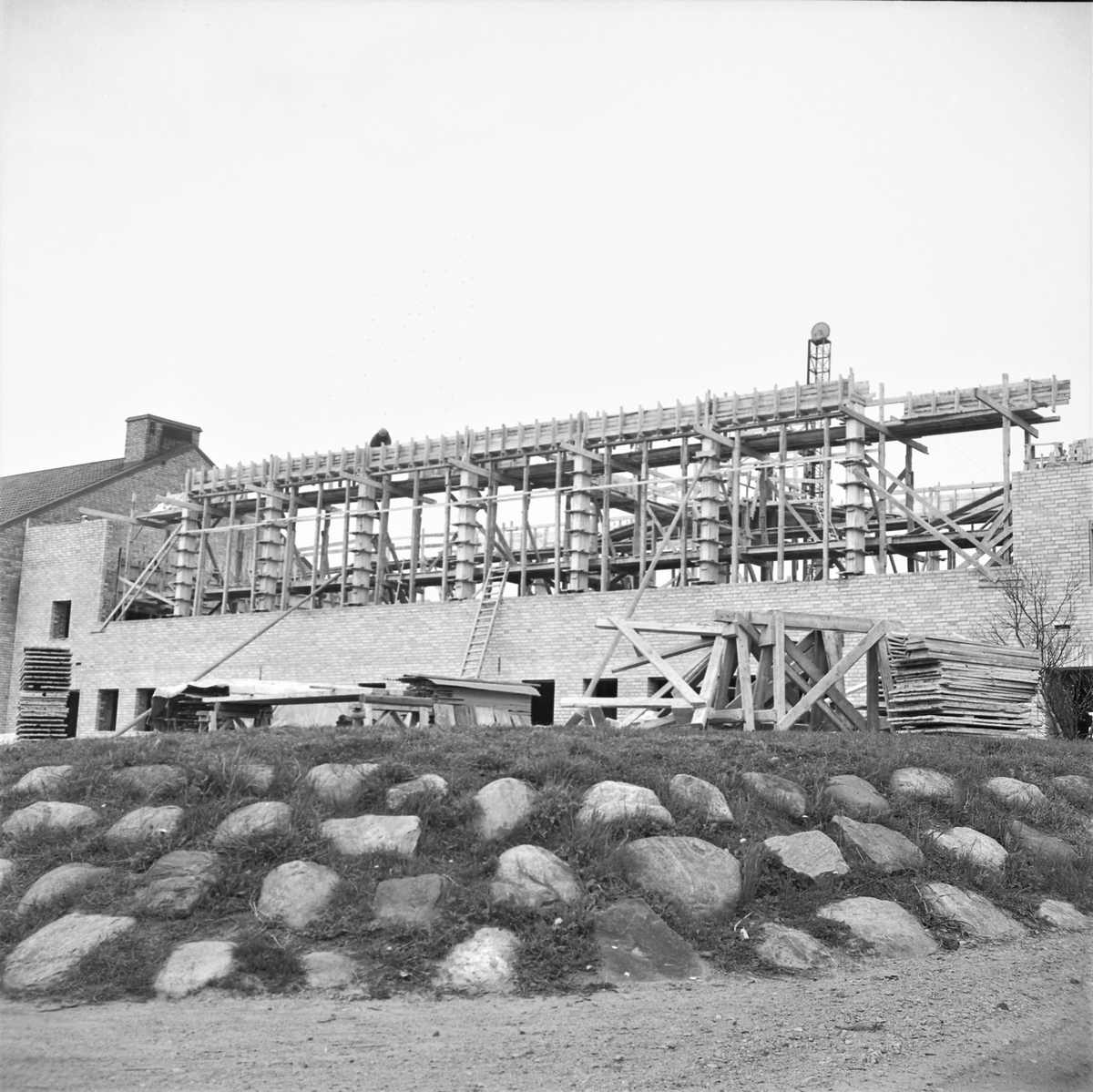 Hagaskolans nya gymnastikbyggnad i Varberg, kv Orren 1. Bild 1 visar byggnaden och på bild 2 sitter ett par män vid ett mötesbord. Artikel i samband med bilden publicerad i Varbergs Tidning 1958-05-21.
