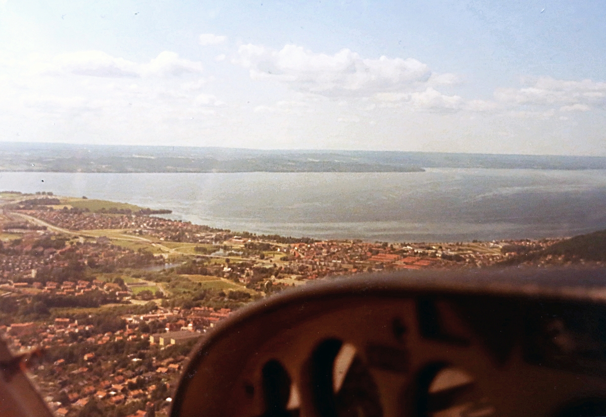 Flygfoto över Jönköping med Vättern i bakgrunden, taget från ett sportflygplan, omkring 1977-1978.