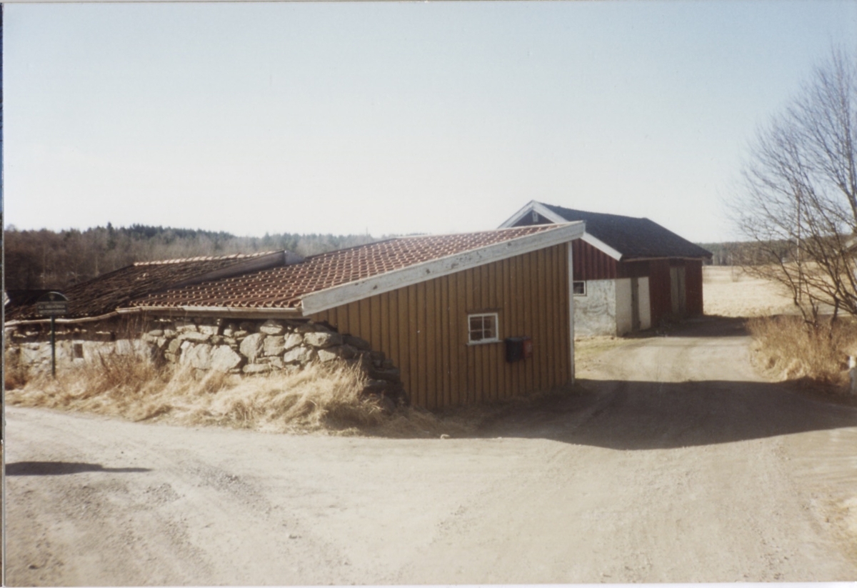 Tulebo Nordgård 1:6 "Mossen", "Helgessons" cirka 1990. Till vänster: stensmedjan, garaget och ladugården. Boningshuset låg mittemot ladugården.