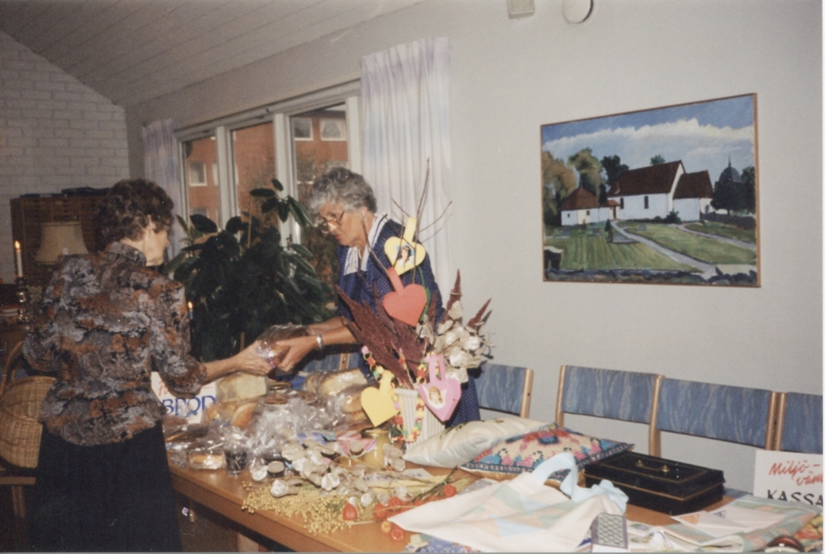 Arbetskretsens försäljning i Kållereds församlingshem (Svenska kyrkan) på Vommedalsvägen 16, 1997. Från vänster: 1. Okänd kvinna. 2. Ingeborg Flink.